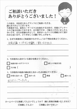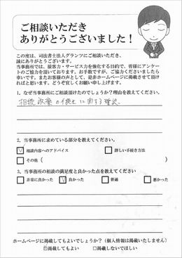 もともとは不動産の抵当権削除をお願いできる司法書士の先生を探していたのですが、よい機会と思い、今回相談させていただきました。