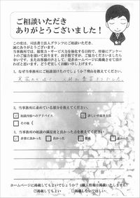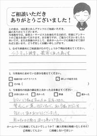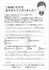 当方が抱えている不安や問題についてとてもわかりやすく詳しくご説明いただきました。質問したことには何でも丁寧にお答えくださり、今後も安心しておまかせできると思っております。