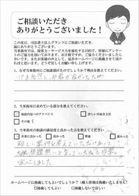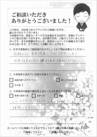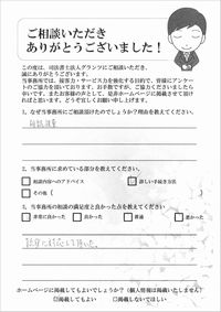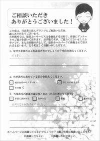 手続きだけでなく、複雑な親族関係についても相談させて頂き、大変安心致しました。相続手続きだけでなく、今後生じる恐れのある負の相続のほうき方法についてもアドバイスを頂き、とても参考になりました。女性の方で、とても相談しやすかったです。